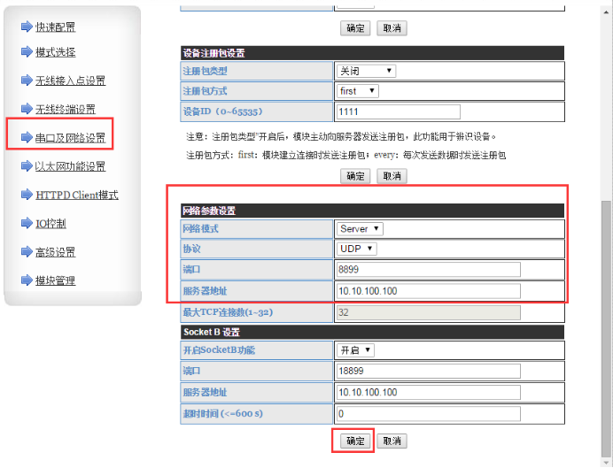 1.在串口及网络设置中设置网络模式为UDP server,端口8899 。点击确定,重启模块。
