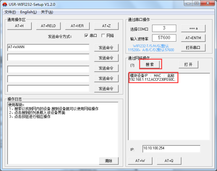 1.通过网络搜索。局域网内电脑,打开USR-WIFI232-Setup软件(直接点击软件名称可以进入下载链接),点击搜索,即可看到模块的IP。