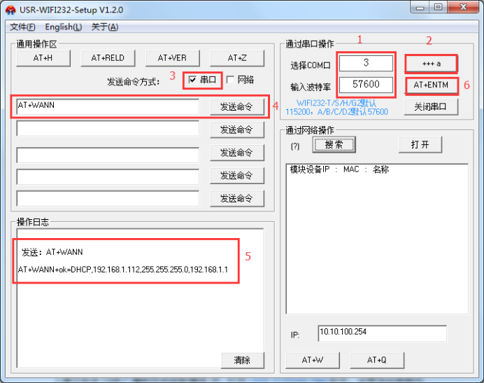 2.通过串口读取。模块串口连接电脑,打开USR-WIFI232-Setup软件(直接点击软件名称可以进入下载链接),选择COM口和波特率,发送+++ a(成功会返回+ok,没有返回的话请检查硬件连接及串口线),发送命令方式选择串口,发送AT+WANN查询,查询结束后要点击AT+ENTM返回通讯。