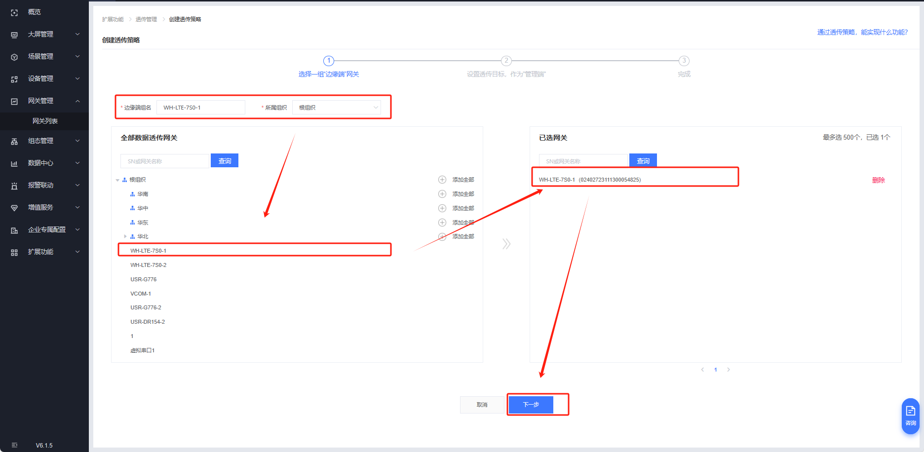 边缘端命名WH-LTE-7S0-1透传测试,选择根组织,选中WH-LTE-7S0-1,下一步