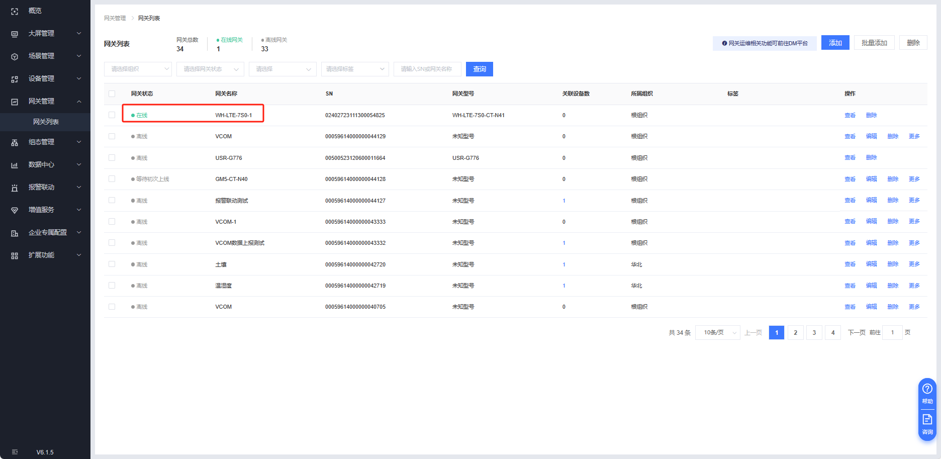 等待1分钟即可看到WH-LTE-7S0-1在有人云端在线
