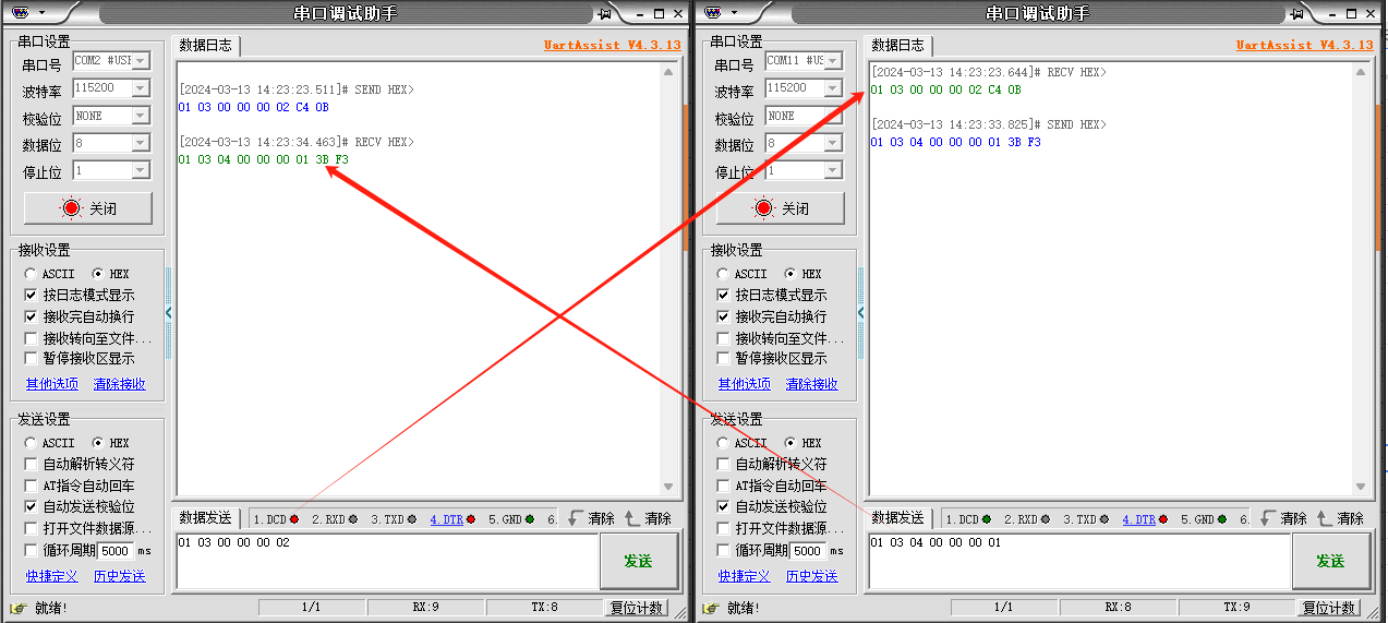 打开两个串口调试助手,引用两个WH-LTE-7S0的串口,进行数据互发测试。