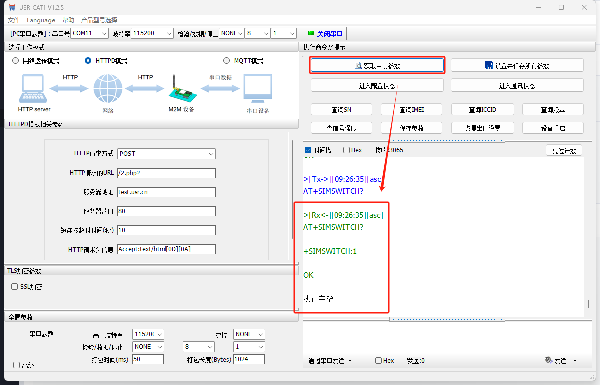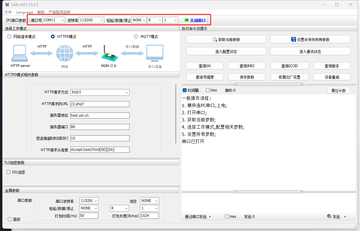 打开WH-LTE-7S0上位机软件,选择COM11,115200 NONE 8 1,打开串口。
