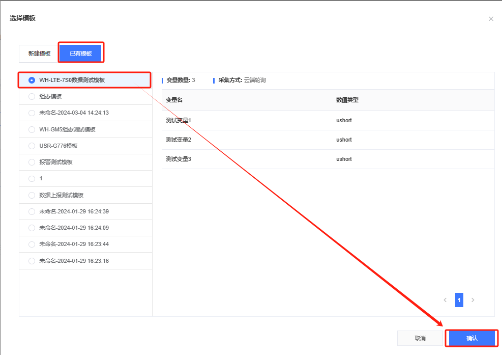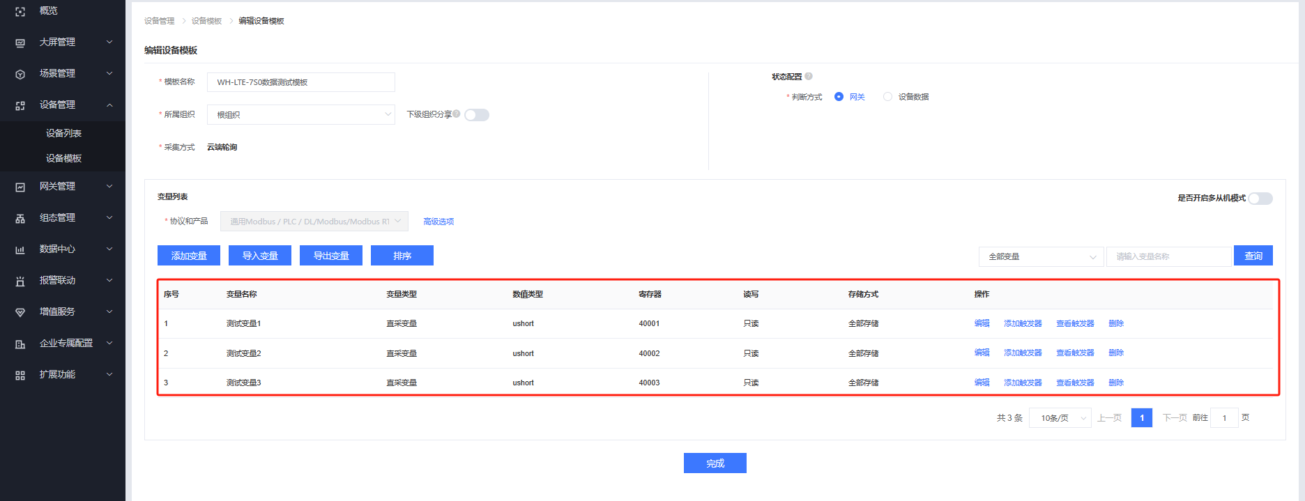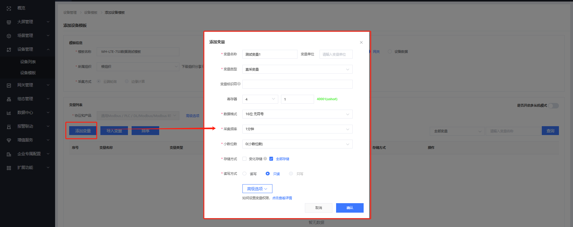 填入模板名称,选择根组织,采集方式选择云端轮询,协议选择通用Modbus/PLC/DL / Modbus / Modbus RTU,点击添加变量