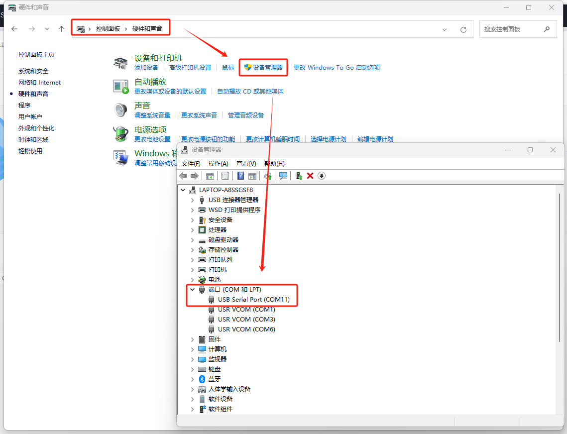 打开电脑控制控制面板---硬件和声音---设备管理器---COM和LPT,确认COM口为COM11。