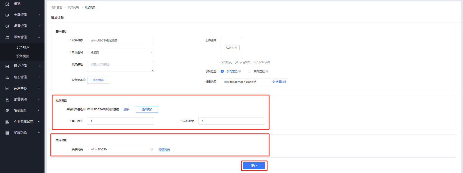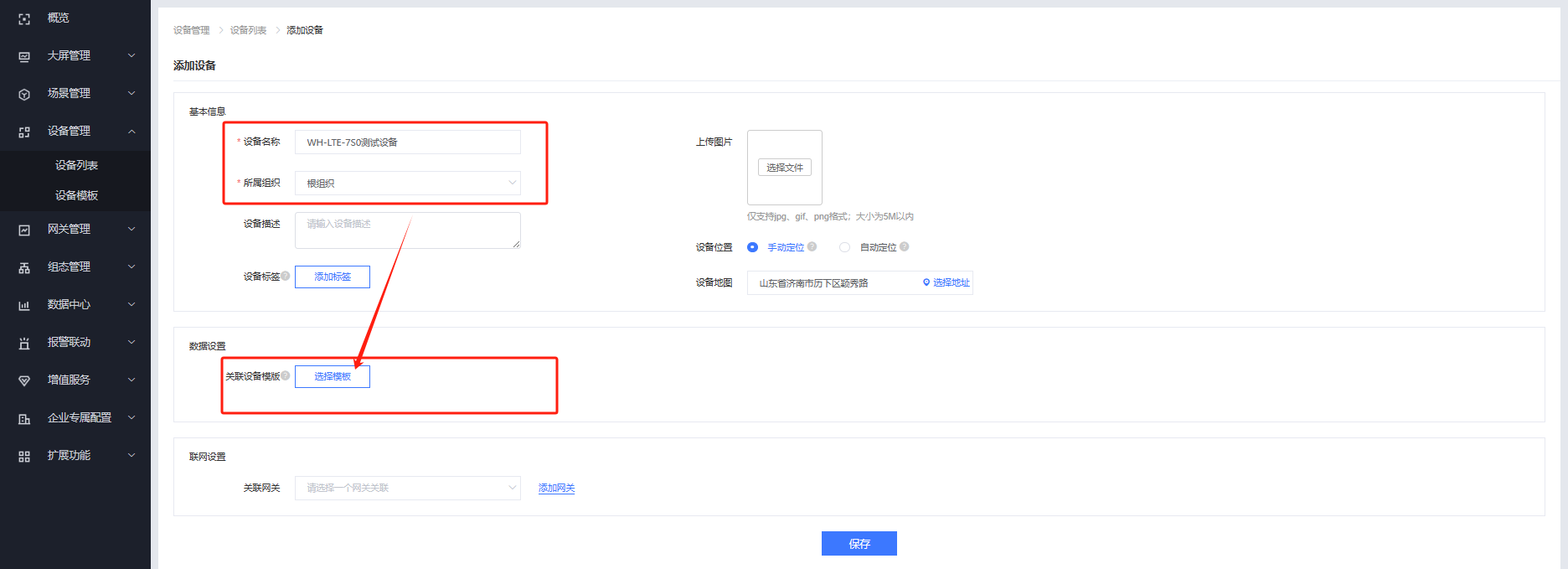 添加设备并关联模板和网关,点击保存