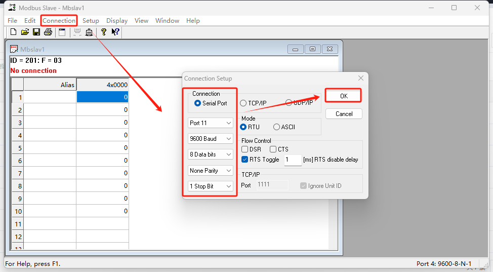 打开Modbus Slave 软件,选择COM11,填入WH-LTE-7S0的参数 9600 none 8 1,点击OK