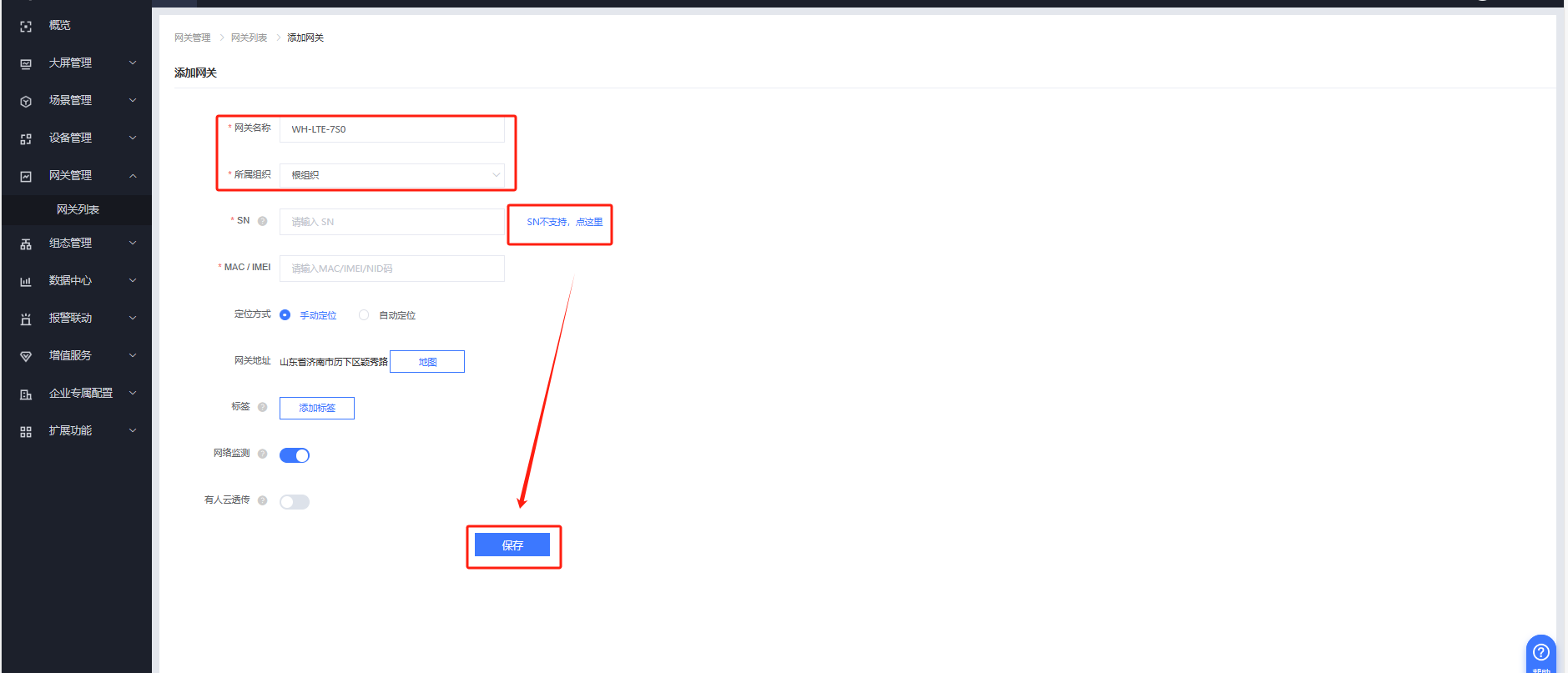 填入网关名称---选择根组织,选择“SN不支持,点这里” 点击保存。