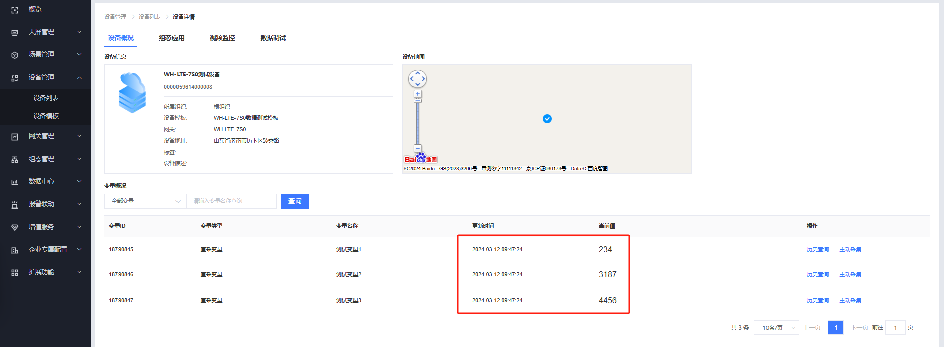 在modbus slave 软件中填入三个数据,即可在有人云端查看到相应的数据