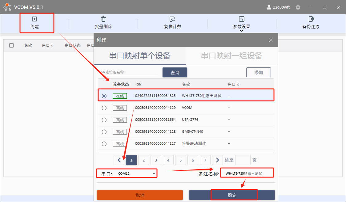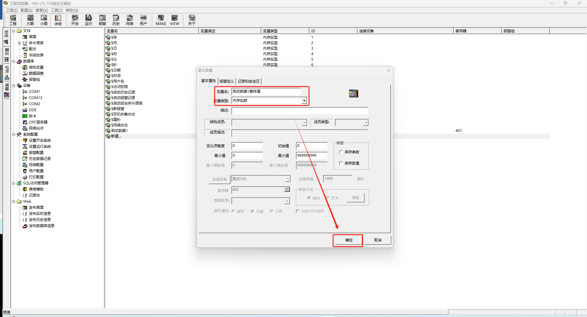 创建---选择设备WH-LTE-7S0---选择串口号COM12---备注名称为WH-LTE-7S0组态王测试---确定