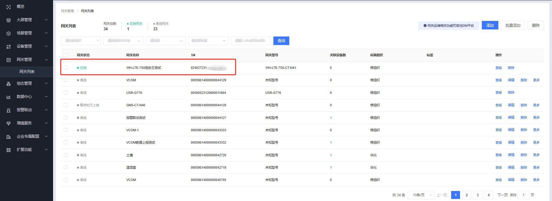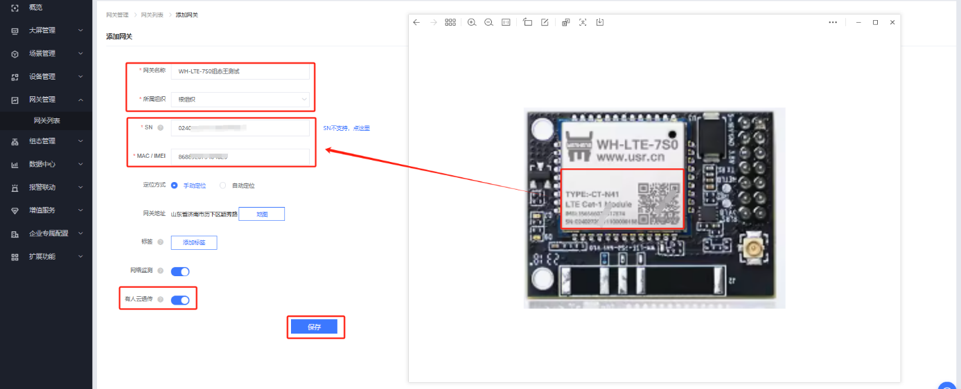 填入设备名称,选择根组织,填入WH-LTE-7S0丝印上的SN和IMEI,开启有人云透传,点击保存。