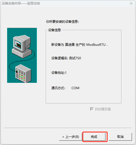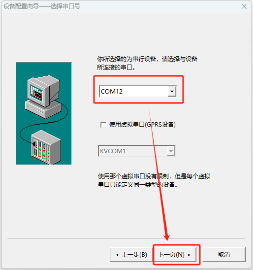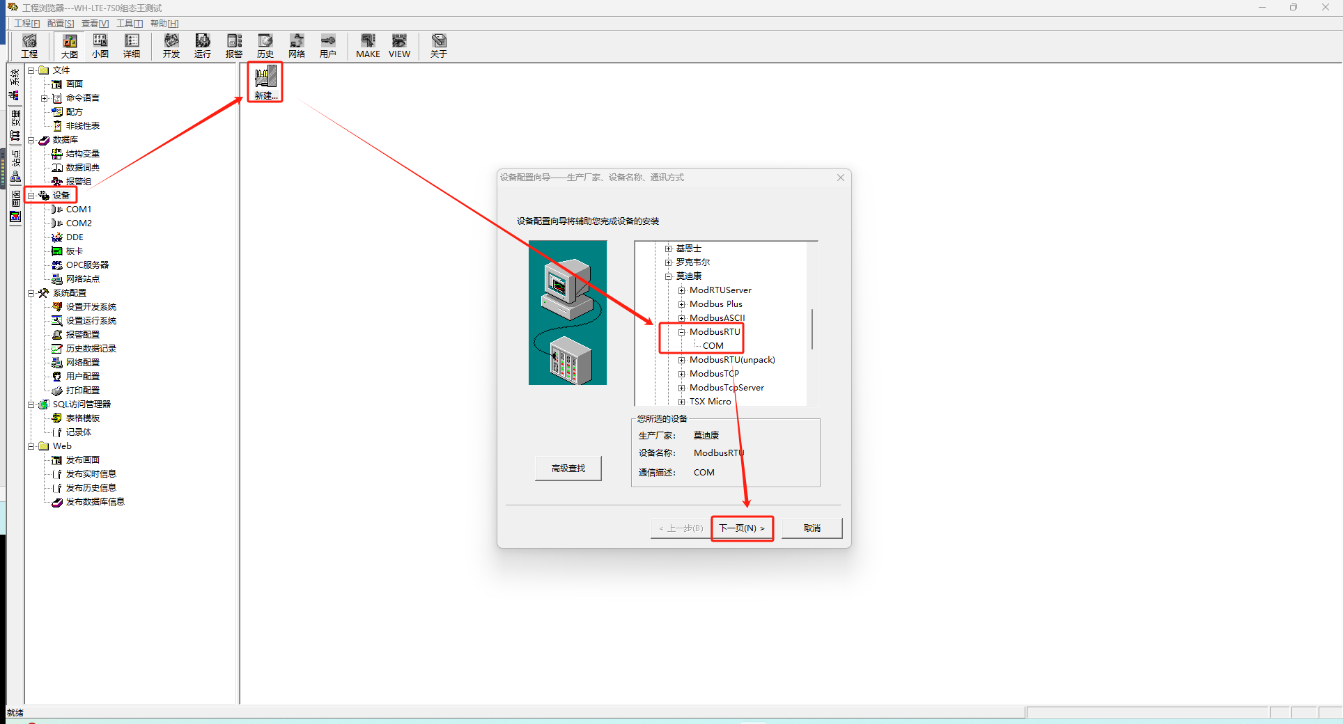 双击工程进入配置页面:设备---新建---PLC---莫迪康---modbus rtu---COM---下一页