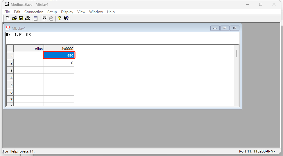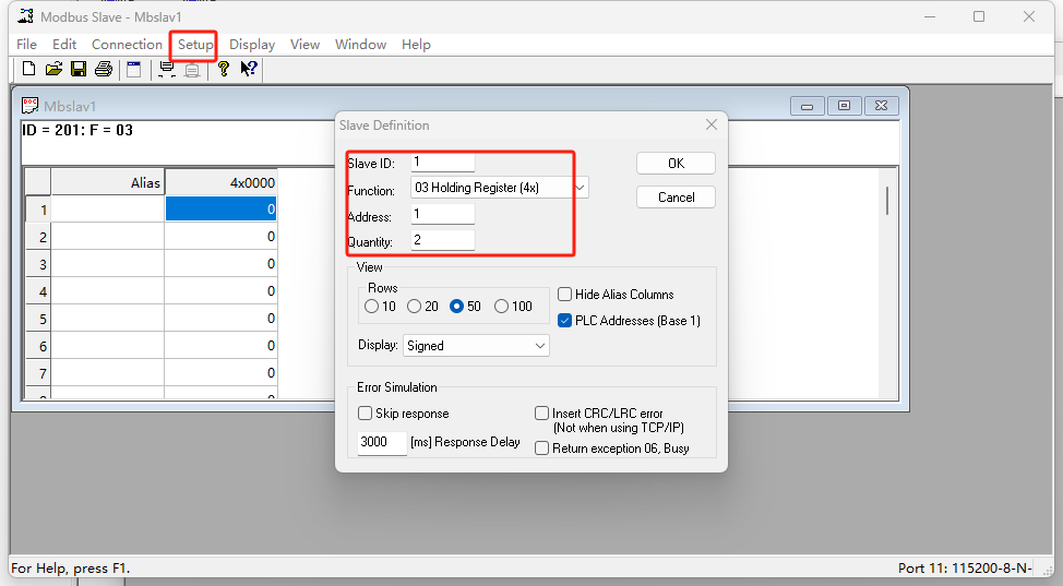 打开Modbus Slave软件,引用USB转232转换器的COM端口号COM11