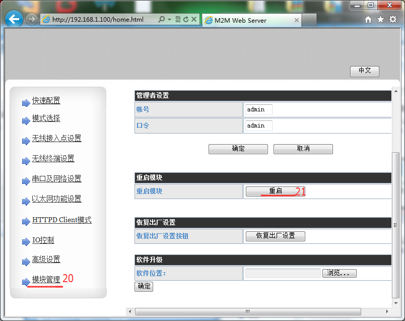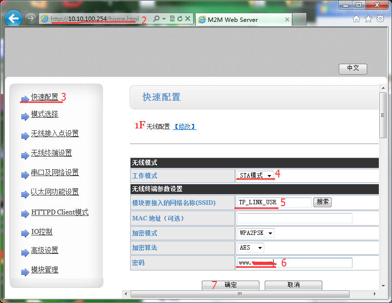 4.打开浏览器(建议使用IE浏览器),在地址栏中输入10.10.100.254,账户密码为admin。进入到网页,修改模块参数,使模块连接到路由器AP中。