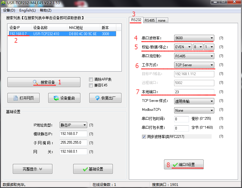 使用设置软件设置参数:搜索设备,设置串口服务器的IP地址与局域网网段一致,设置串口服务器的波特率为9600,校验数据位停止位:EVEN 8 1。