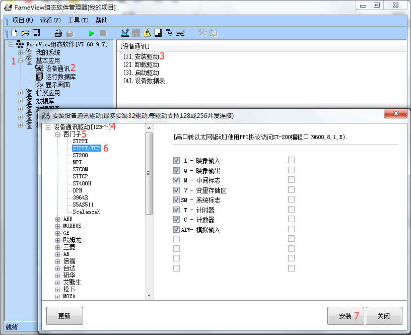 d)基本应用--设备通讯--安装驱动--设备通讯驱动--西门子--S7PPI/TCP--安装