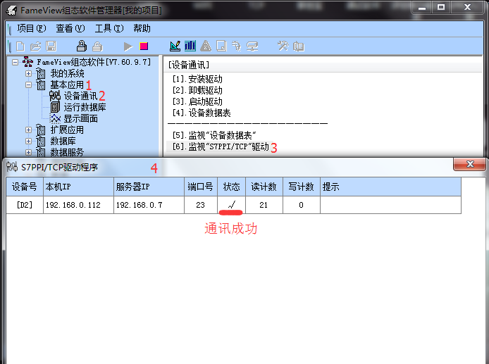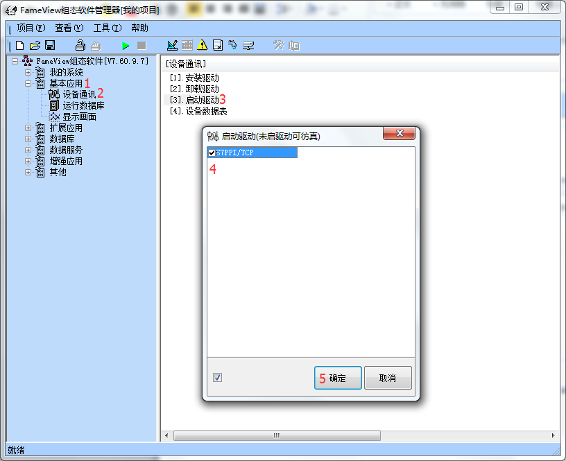 e)基本应用--设备通讯--启动驱动--S7PPI/TCP--确定