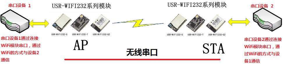 这一应用中,两个USR-WIFI23低功耗模块通过WIFI点对点连接,如图所示,该组网方式为用户设备搭建了一个透明串口通路。