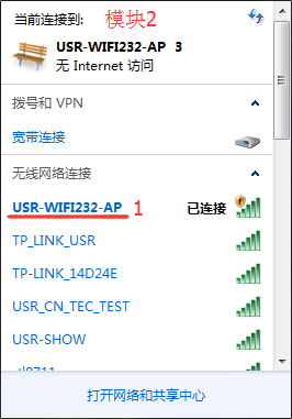 当模块2(STA)启动后会找模块1(AP)的SSID(USR-WIFI-T)。然后模块2TCP client 端连接模块1的TCP server。所有连接自动完成。然后两边的UART就可以透明传输数据。
