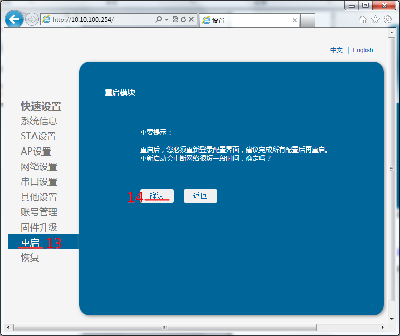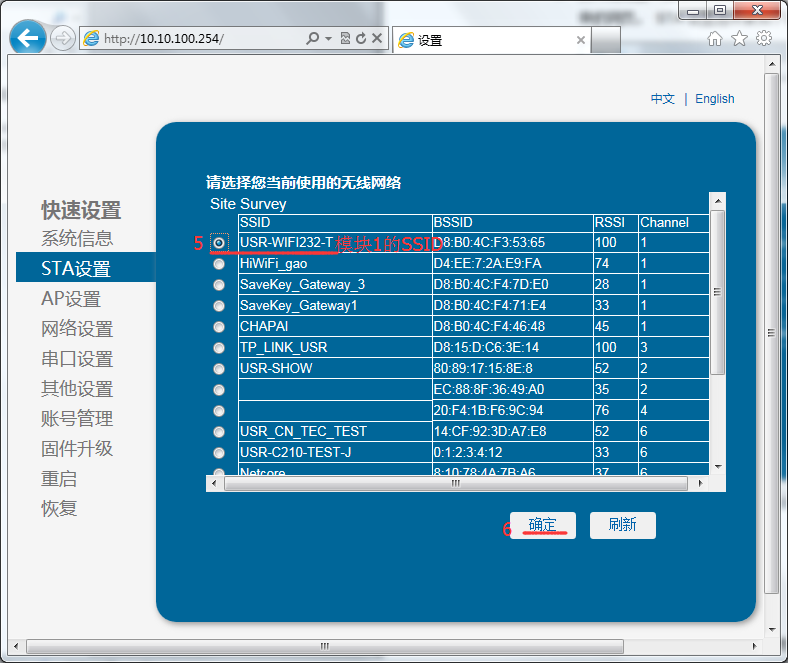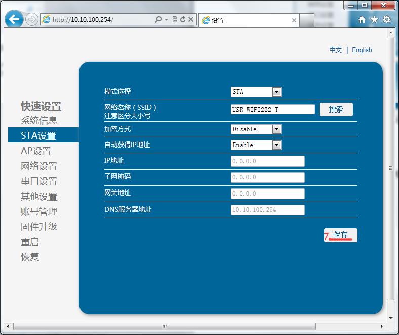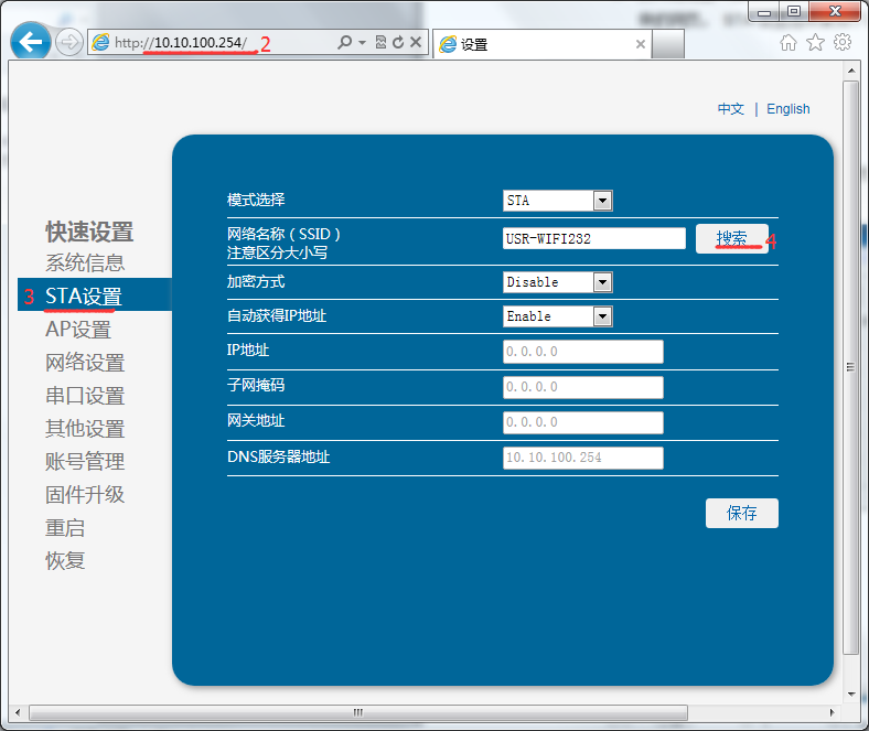 b.打开浏览器(推荐使用IE),输入10.10.100.254,账户密码admin,进入模块的网页, STA设置选项做如下设置。
