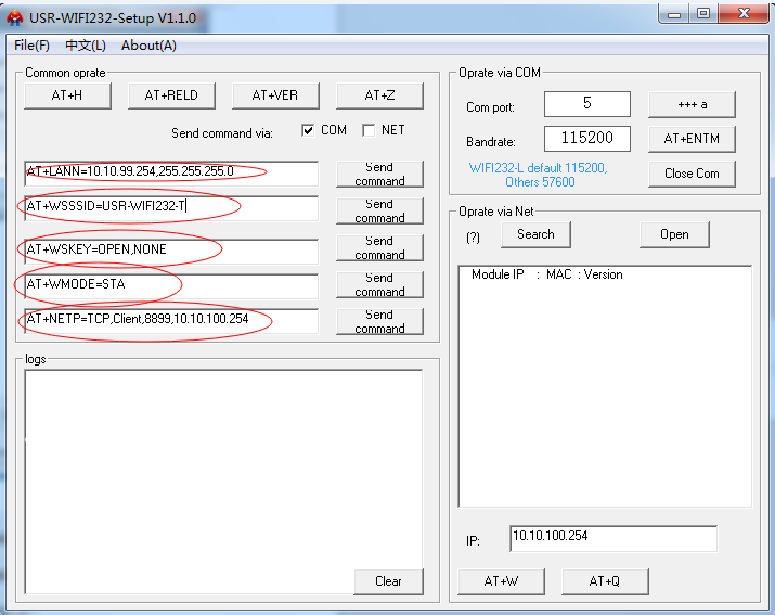 (2)模块2设置为STA模式,SSID设为需要连接AP的SSID.(如USR-WIFI-T),默认为DHCP,网络协议设置为TCP/Client模式,协议端口8899,目标IP地址设为模块1的地址。即10.10.100.254。设置LAN口地址为10.10.99.254.(STA模块LAN口地址和AP模块的LAN口地址不能在相同网段)。