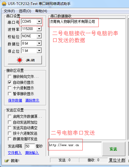 二、测试数据收发: 两台电脑分别有一个串口,1号电脑串口号为com3 ,1号电脑连接做AP模式WiFi模块的串口,2号电脑串口号为com5,2号电脑连接做STA模式WiFi模块的串口。