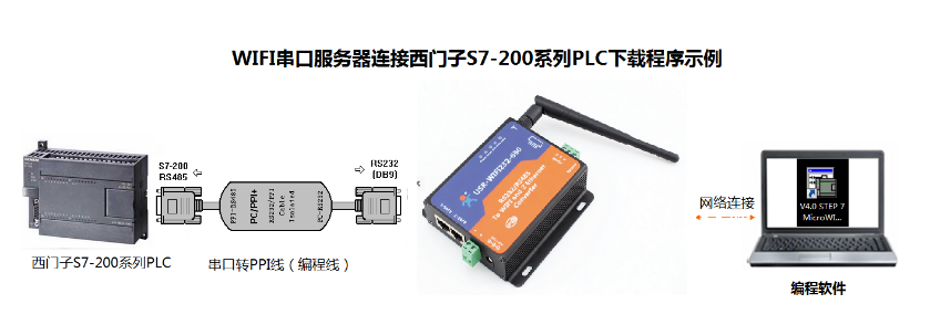 硬件连接:S7-200 PLC连接PPI编程线缆,PPI编程线缆的RS232端连接WIFI串口服务器的RS232口,WIFI串口服务器网口连接电脑网口或者路由器网口。