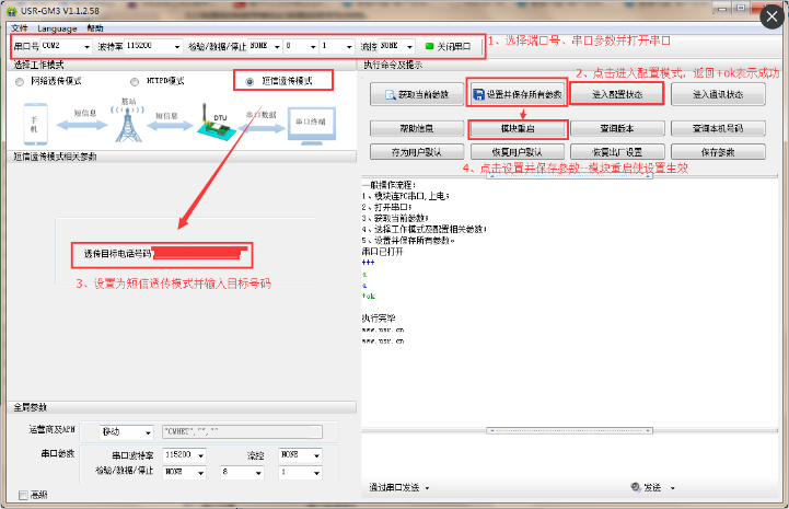 (1) 设置目标手机号码,目标手机号码是与模块进行通信的手机号,应根据实际使用号码进行设置。