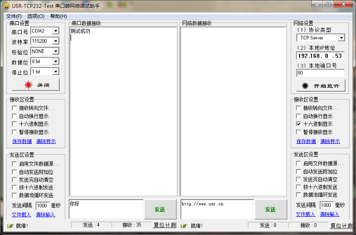 2:电脑串口连接GM3串口,使用串口调试助手软件发送数据:你好并用手机返回测试成功