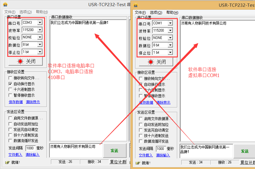 打开两个USR_TCP232_Test软件,一个连接COM3,一个连接虚拟串口COM1,实现两个串口直接数据互发。