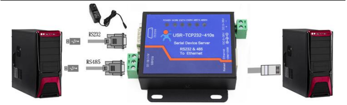 1.将 410S(USR-TCP232-410S,简称 410S 下同)的串口通过串口线(或USB 转串口线)与计算机相连接,通过网线将 410S 的网口 PC 的网口相连接,检测硬件连接无错误后,接入我们配送的电源适配器,给 410S 供电。观察指示灯状态确定410S是否正常工作:POWER灯常亮,WORK灯闪烁。