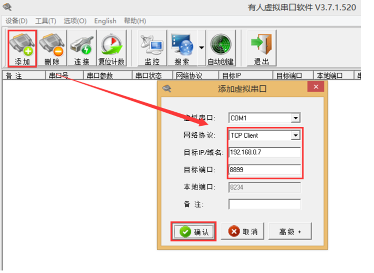 打开虚拟串口软件,点击“添加”在弹出的窗口中设置虚拟串口信息,由于上述410S设备采用TCP server协议,所以此处网络协议设置为TCP client。目标IP和目标端口设置为410S的IP和端口。然后点击“确定”,建立虚拟串口COM1.