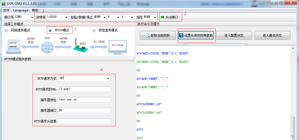 5、模块设置参数:打开设置软件,模块设置为Httpd Client模式,请求方式GET,URL为/1.php?,设置服务器地址test.usr.cn,端口80,设置并保存所有参数,重启模块。(本说明文档使用为有人测试服务器)