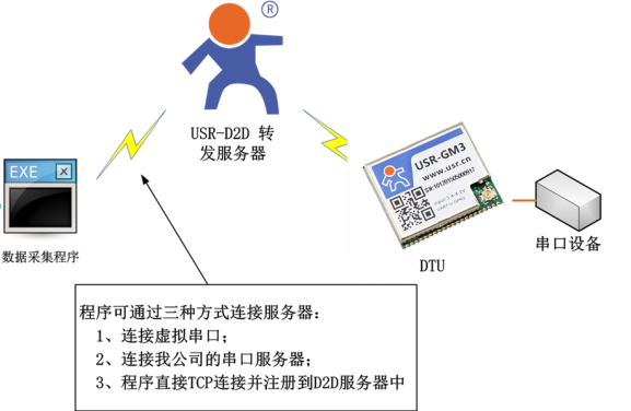 串口软件连接GM3。需要远程采集串口设备的数据,无需搭建公网服务器,用户计算机无需连接互联网。利用USR-D2D转发服务器,转发串口设备通过DTU设备传输的数据到另一台DTU。实现远程透明串口传输数据,无需改变用户原有的软件和环境,即可实现远程通信。