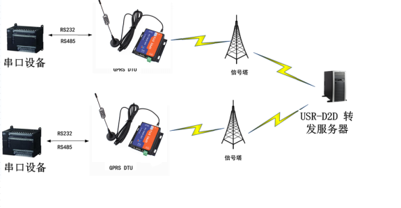 实现:两个GPRS DTU 模块都主动去连接D2D转发服务器,服务器将对两个GPRS模块 的串口数据进行转发。从而实现串口软件和串口设备或者 串口设备与串口设备之间的串口通信。