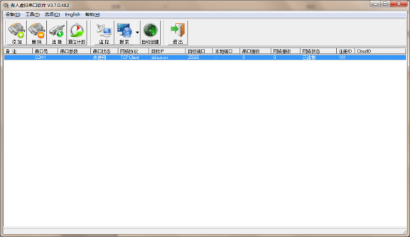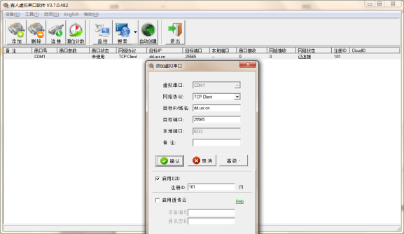 打开设置软件“添加”选择虚拟的串口号。网络协议是TCP Client ,目标地址是dd.usr.cn.目标端口是25565.