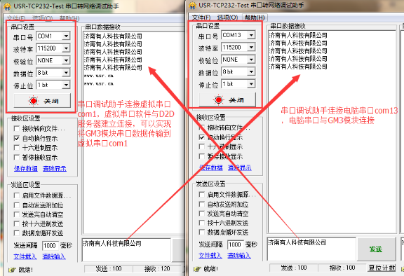 打开串口调试助手软件,打开两个窗口界面:一个窗口连接虚拟串口com1.另一个窗口连接电脑串口com13。
