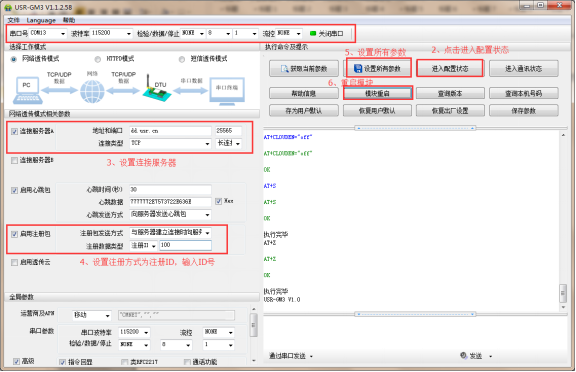1:GPRS-DTU设置软件设置连接D2D服务器和注册ID的方法。