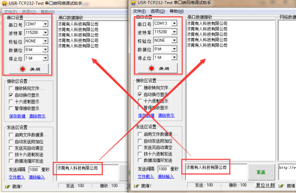 打开串口调试助手软件,打开两个窗口界面:一个窗口连接电脑串口com13.另一个窗口连接电脑串口com7。Com13发送的数据com7可以接收。Com7发送的数据com13可以接收。