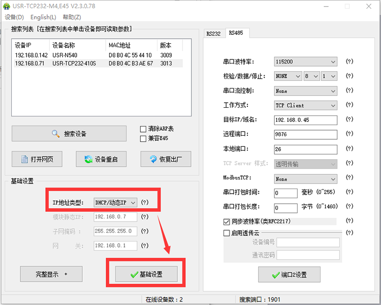 5、打开参数设置软件USR-TCP232-M4,E45-V2.3.0.78.exe ,点击“搜索设备”,点击搜索到的模块IP,选择是通过RS485串口还是 RS232串口进行通信,此处以RS232串口举例,配置参数如图,点击“端口1设置”