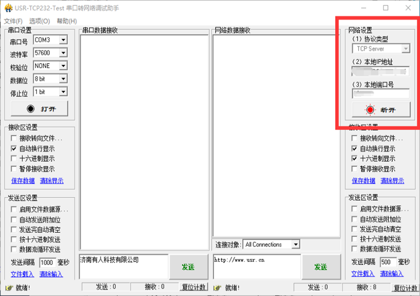 4、重启后,在串口发送区发送数据,此时在服务器上可以接收到串口发送的数据,如图
