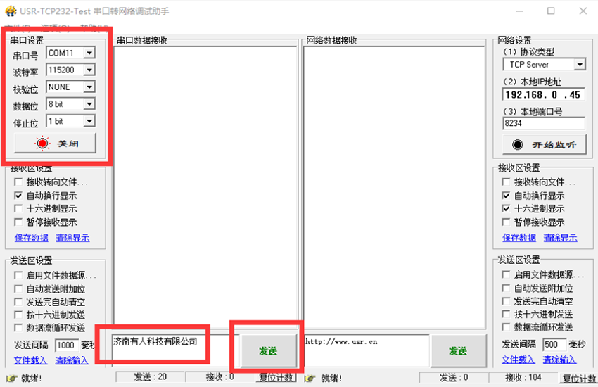 4、重启后,在串口发送区发送数据,此时在服务器上可以接收到串口发送的数据,如图