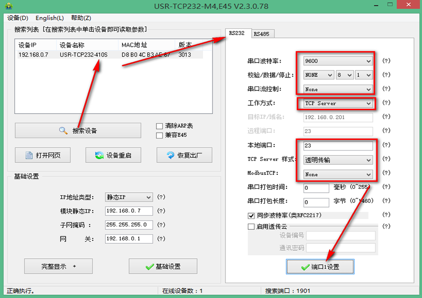 一、将串口服务器网口直连电脑网口或者连接路由器网口。使用设置软件设置参数:搜索设备,设置串口服务器的IP地址与局域网网段一致,设置串口服务器的波特率为9600,校验数据位停止位:NONE 8 1。这个参数要和PLC的参数一致,然后点击端口1设置。
