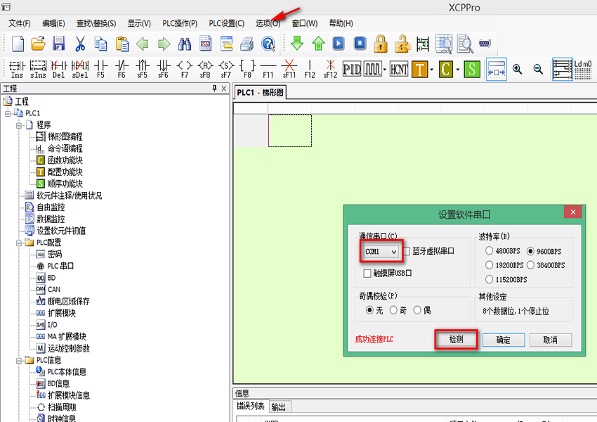 选择对应的虚拟COM口,进行检测,会显示成功连接PLC