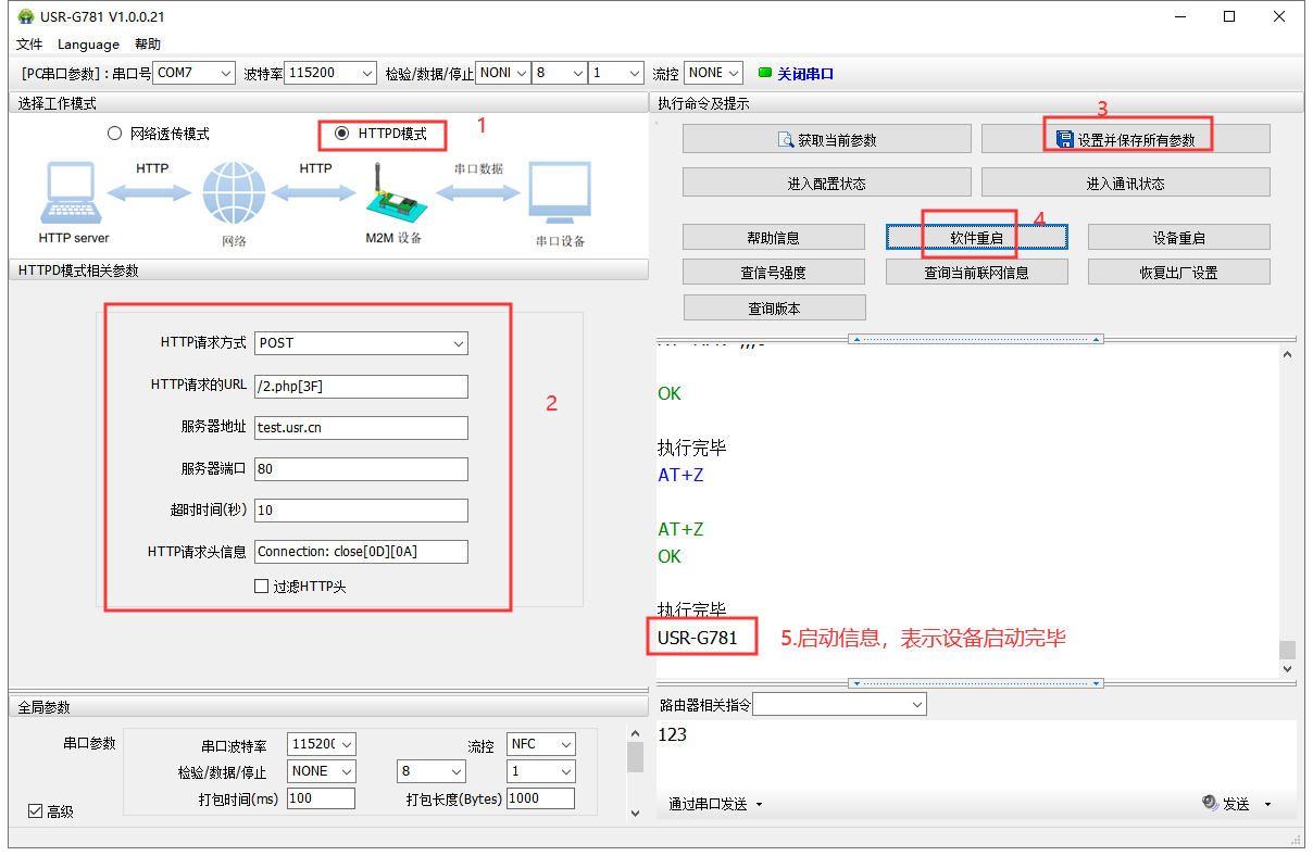 5>待重启完毕后会在串口打印USR-G781字样,表示设备启动完成。