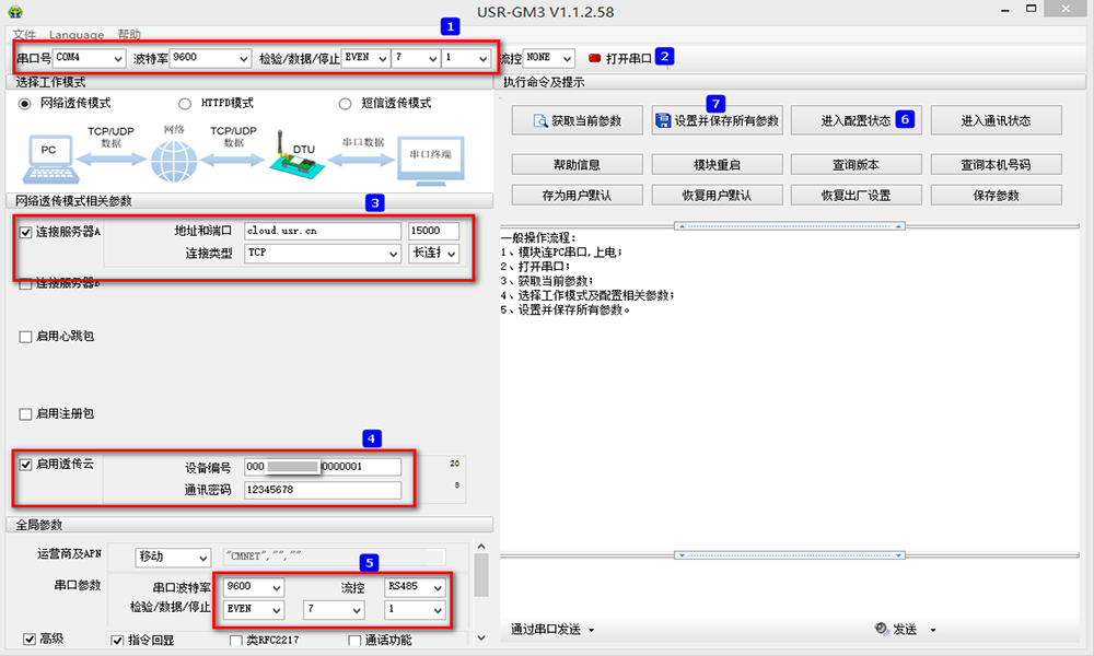 二、设置730需要连接到的服务器地址:cloud.usr.cn,端口号:15000,连接类型:TCP长连接