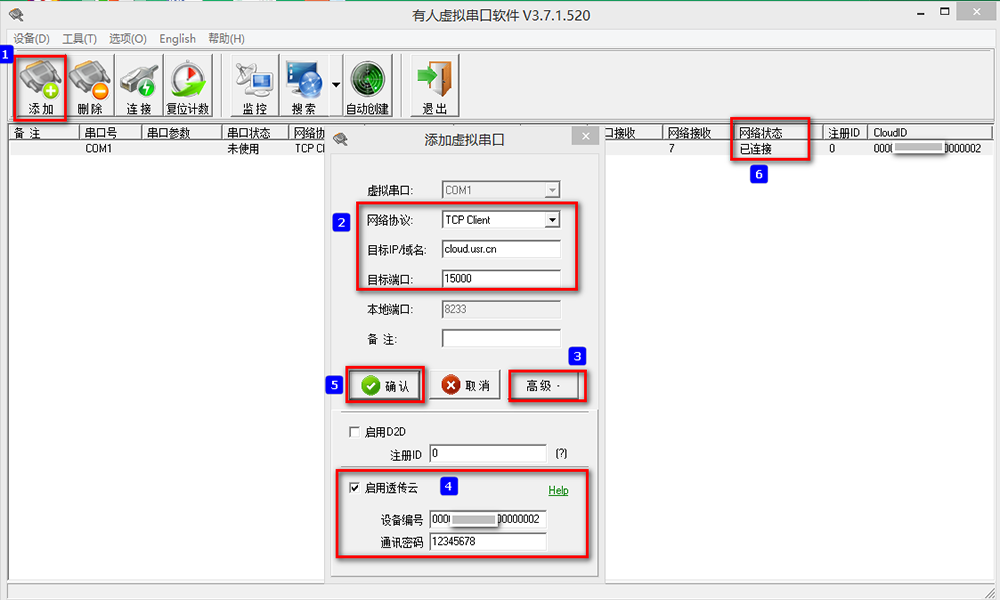 六、PC端安装好虚拟串口软件,打开进行添加虚拟COM口,具体步骤如下。