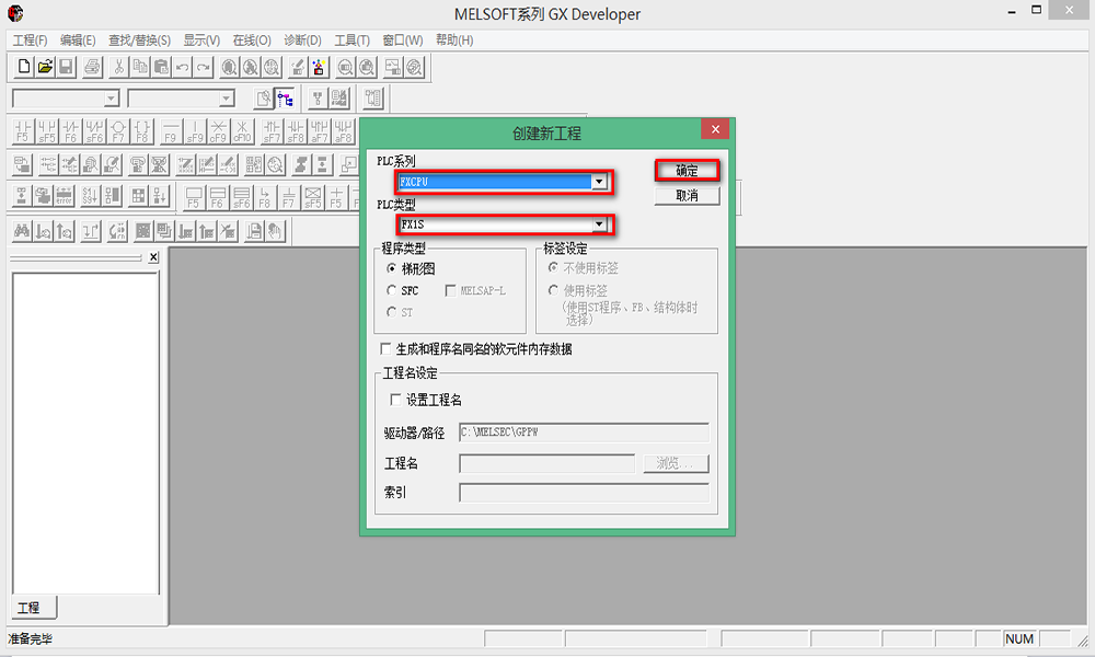 七、打开三菱上位机软件GX,点击“工程-创建新工程”