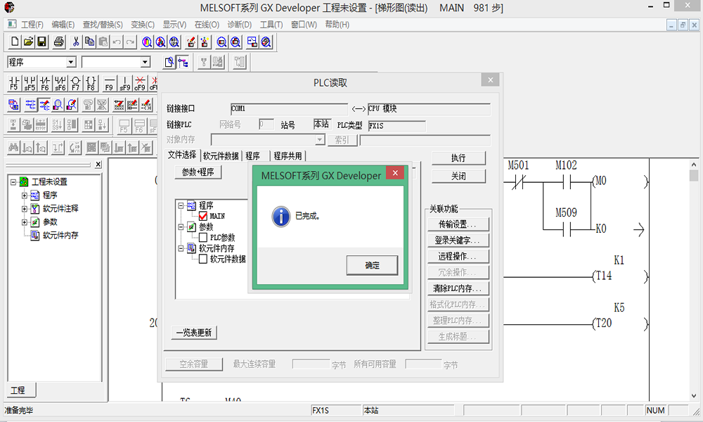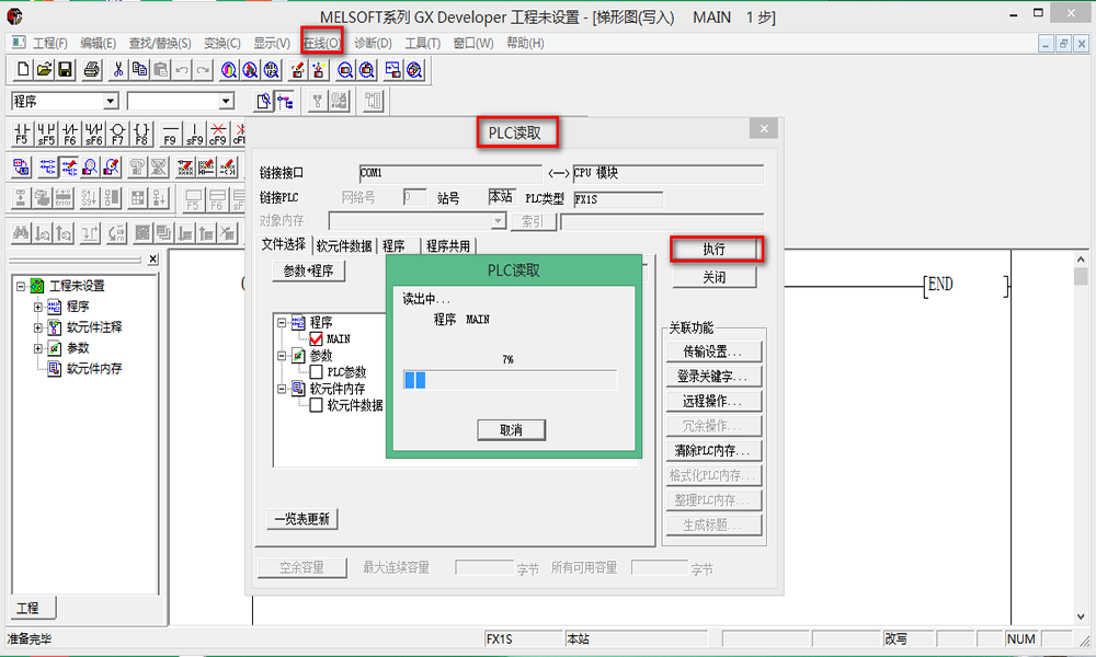 十二、退出此界面,点击“在线-PLC读取”,点击“执行”,会显示下载进度