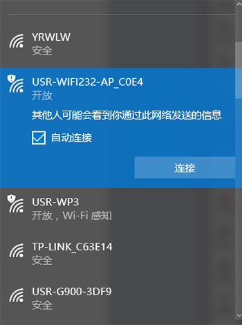 1、将WiFi高性能模块插到到配套评估板上,评估板串口连接电脑,默认模块工作在AP模式下,电脑搜索并连接其AP热点,如图